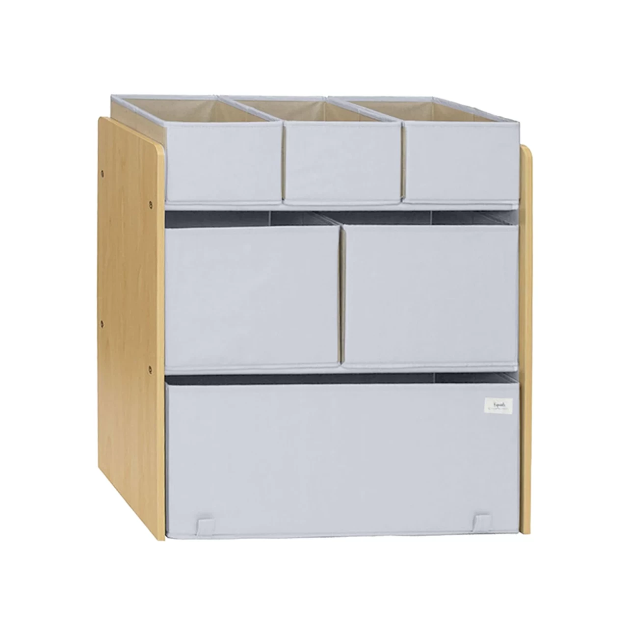 The 3 Sprouts Multi-Bin Recycled Fabric Toy Organizer features 6 storage boxes in differing sizes to store and organize your child’s books, toys, art supplies and more! Designed to be the perfect kid-sized height, it allows your child to clearly view and select their favorite toys and makes it easy for them to clean up when they’re done playing. Easy assembly with a wooden frame for stability, this multi-bin is the modern storage solution for your living room, bedroom or playroom. Available in solid colors and prints.