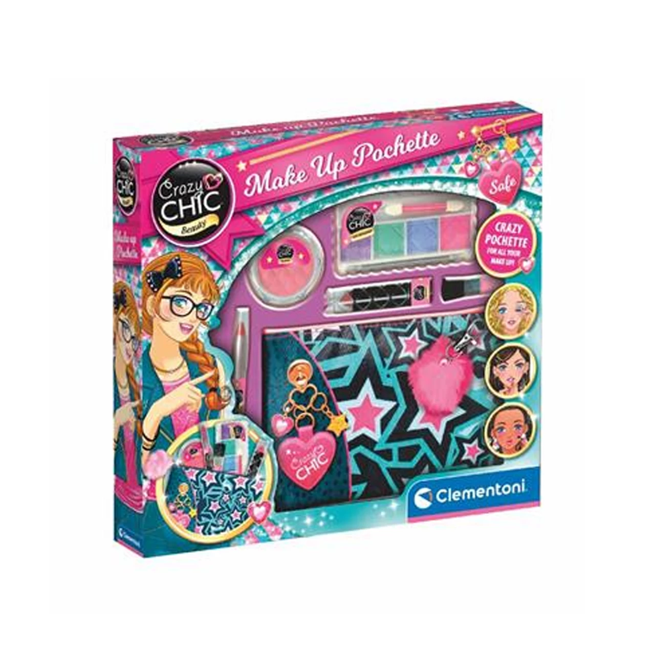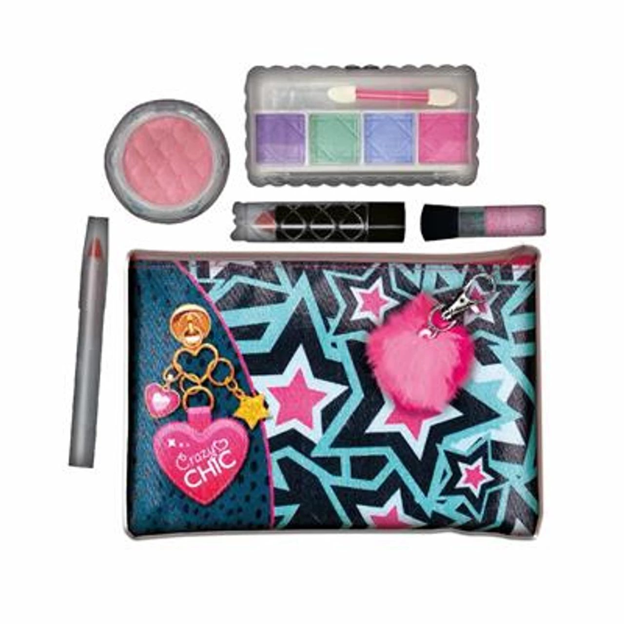 The cosmetic bag has a personalised Crazy Chic texture in soft fabric and a decorative pendant to put wherever you want. It contains an eyeshadow palette, brush, lipstick, lipstick and blusher for the perfect make-up for every occasion. The pom-pom zip adds an extra touch of style to the handbag making it very fashionable.
