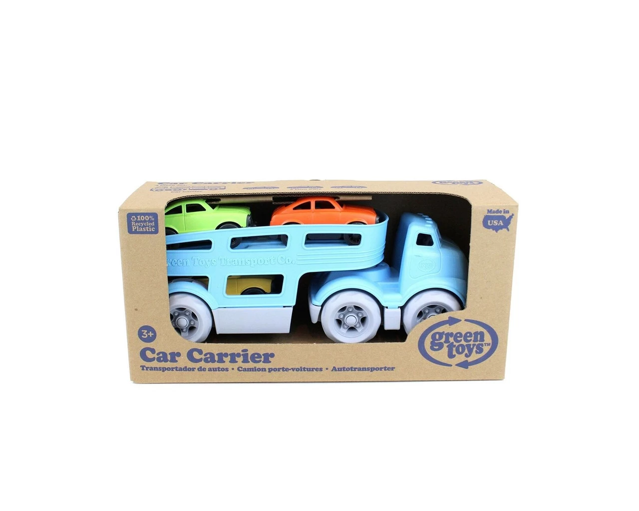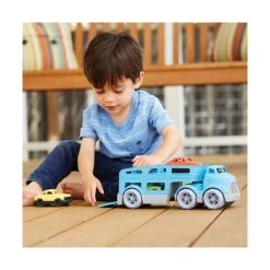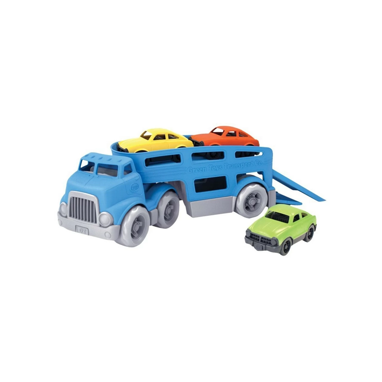 The double-decker Green Toys™ Car Carrier features two working ramps and space for three Mini Cars. With no metal axels or small parts, it’s great for both indoor and outdoor play, and encourages motor skill development and imaginative, creative play. The 5 piece set includes cab with detachable trailer and 3 brightly-colored Mini Cars.