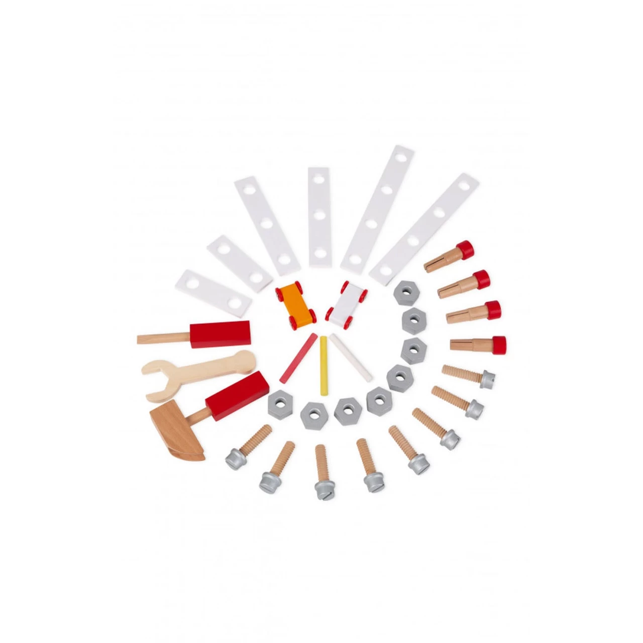 A lovely workbench made of curved wood with 2-sided play surface! Front side: a full magnetic workbench with a clever magnetic tool system to assist children in properly storing their tools, and several accessories to invent objects to endlessly assemble and disassemble to their hearts’ content. Featuring 3 magnetic tools, 29 accessories (wooden nuts, screws and nails, plates, chalks…), a vice, a gear system, and a blackboard (on the side) on which to write using the chalk. All accessories are stored on the front, in the location intended for this purpose. Rear side: a 4-track racing slope with 2 cars that take turns to go down the slope by spinning the rollers and ringing the bells! Giggles guaranteed!