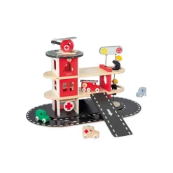 Firefighters, there’s a fire! The alarm sounds, it’s time to jump into your best truck and drive fearlessly towards the fire that needs putting out! For hours of firefighting fun and stories, there’s nothing better than a beautiful 2-storey wooden fire station, that is well equipped and has a rounded look! In this magnificent FSC® wooden toy from the Bolid range, you will find everything you need to satisfy young fans of the fire brigade! From the age of 2, children will be able to imagine the most wonderful adventures by bringing to life the vehicles included: 2 cars, 1 ambulance, 1 fire truck and 1 helicopter to be able to play in the air! A mechanical lift lets you take cars up to the top floor! There are 2 firefighter characters on the ramp (not removable), who move around on it and are always ready to go into action! We love the harmonious colours of this beautiful toy that develops the imagination and works on young children’s motor skills. On certain elements, you can see the colour of the wood for even more authenticity.