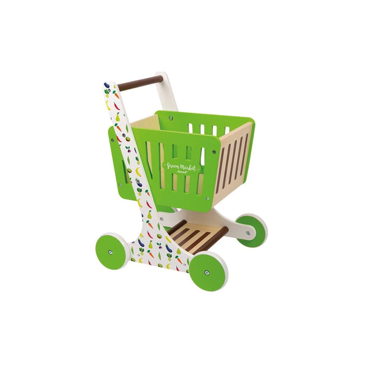 Let’s go shopping! Colourful Green Market-themed shopping trolley. Cushioned handle for comfortable use. |