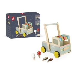Would you prefer sorbet or ice cream? The ice cream seller is coming to town, you’ll have to make up your mind quickly! This wooden walker is as delicious as can be and is suitable for children from 12 months. To our great pleasure they discover walking with this truck-shaped cart in pastel colours and its accessories! With 4 ice creams included, there will be something for everyone. These little treats will find their place in the storage area at the back of the cart, a second storage bin is also accessible at the front. Handy for taking a cuddly friend for a walk, isn’t it? Equipped with silent wheels, this early learning toy is 2 in 1: ideal for helping baby learn to walk, it is also an imitation toy that allows him to imagine himself as a little street vendor! Children from 1 year old will be able to offer ice creams throughout the day, a good way to interact and share some delicious moments. With its fresh design, mixing natural wood and stylish colours, this walker will look great in baby’s world (and his parents’)! It’s summer all year round with this adorable wooden walking cart! Water-based paint, fabric roof, wood from sustainably managed, FSC®-certified forests.