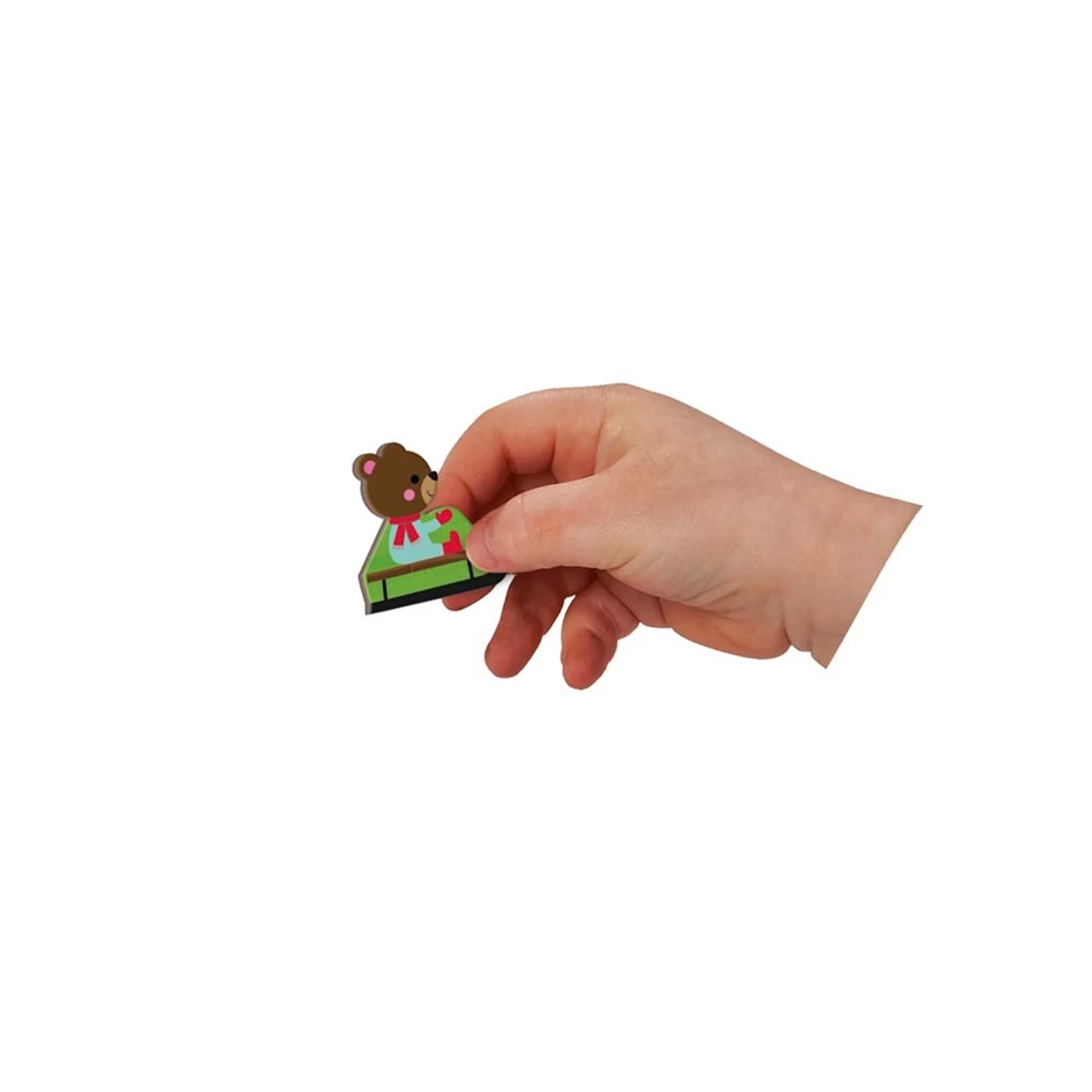 Once the “book” is opened, the aim is to make on the stage the same scene as indicated on the card thanks to the magnets.