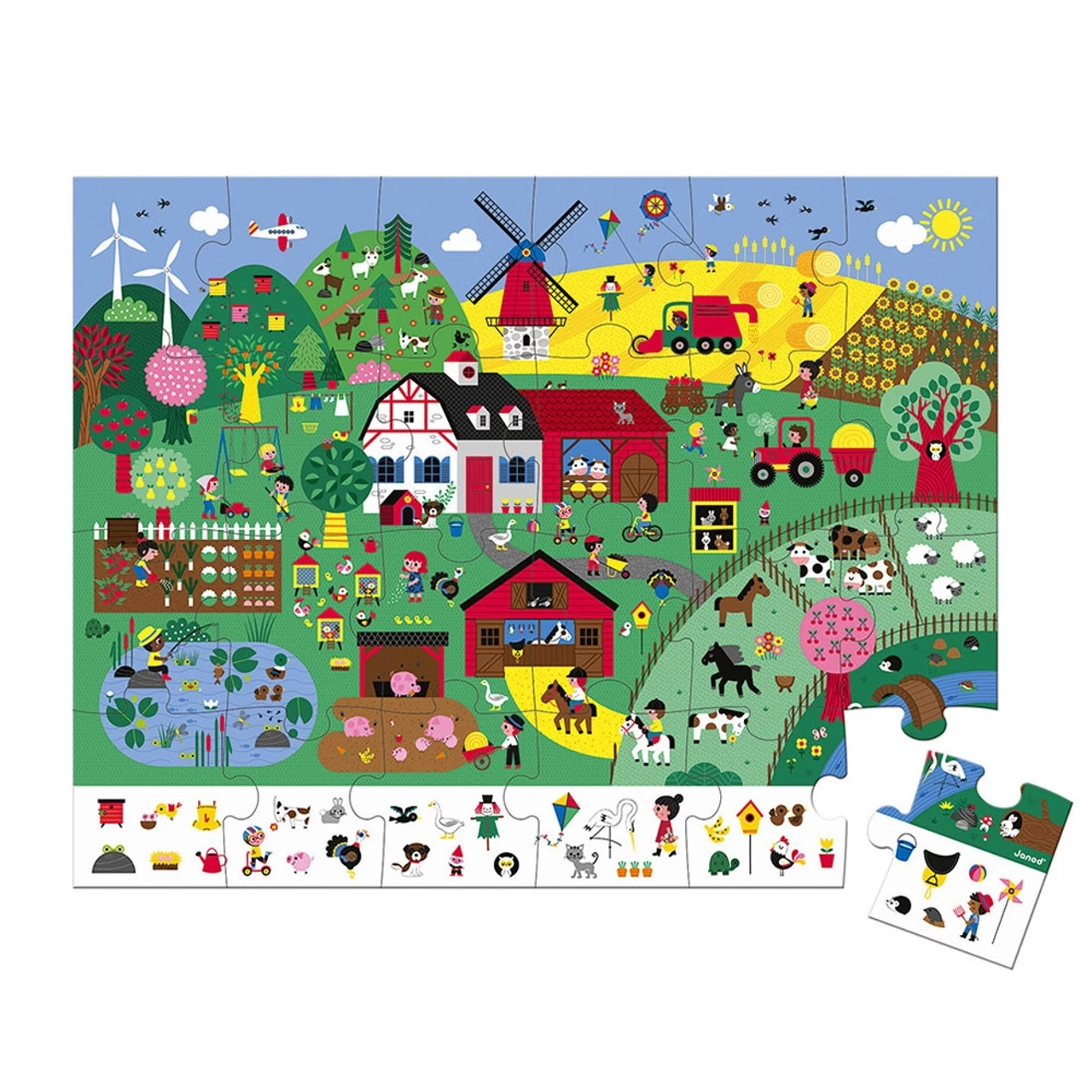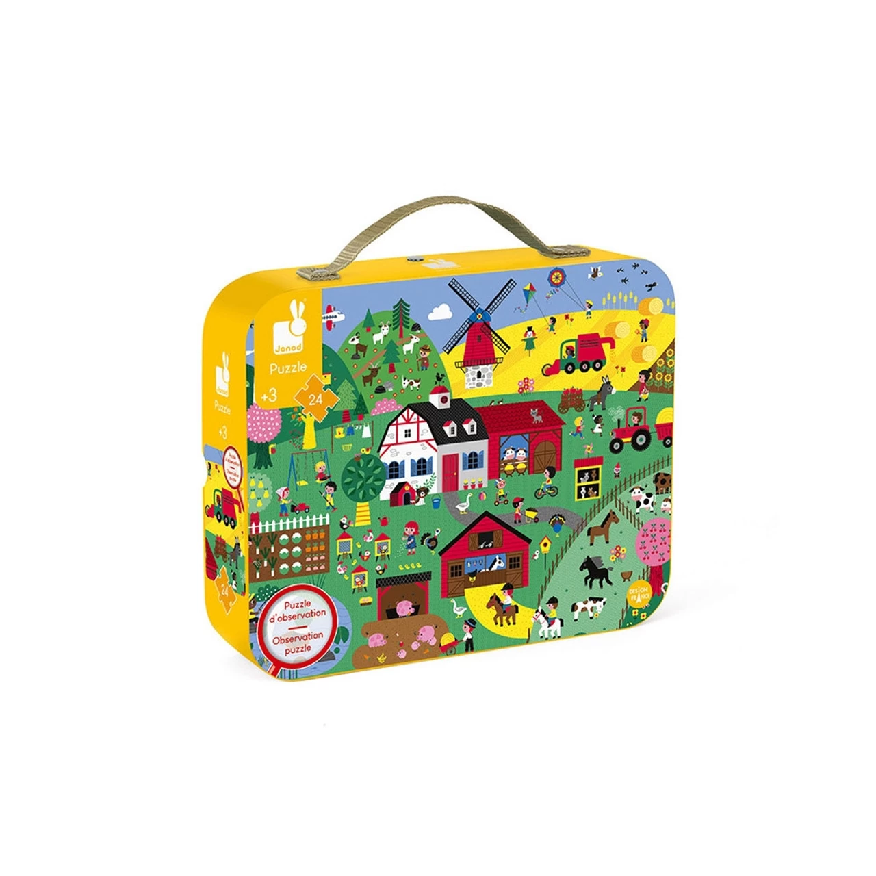 2 toys in 1: a 24-piece puzzle with a farm theme in a lovely box to carry everywhere. The size of the pieces is suitable for small hands and makes it easier for little ones to make the puzzle. Once the puzzle is complete, children will enjoy finding the 29 illustrations that are hidden in the puzzle (as indicated on the bottom of it). Closed box with handle and rivet.