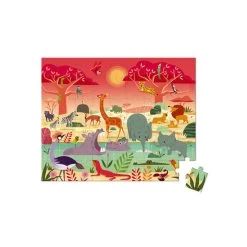 With this cardboard puzzle, your child will explore an animal reserve in Africa, while developing his memory and dexterity. In its pretty suitcase, this puzzle will be easy to transport thanks to its fabric handle. A poster to be used as a template is include. Number of pieces: 54