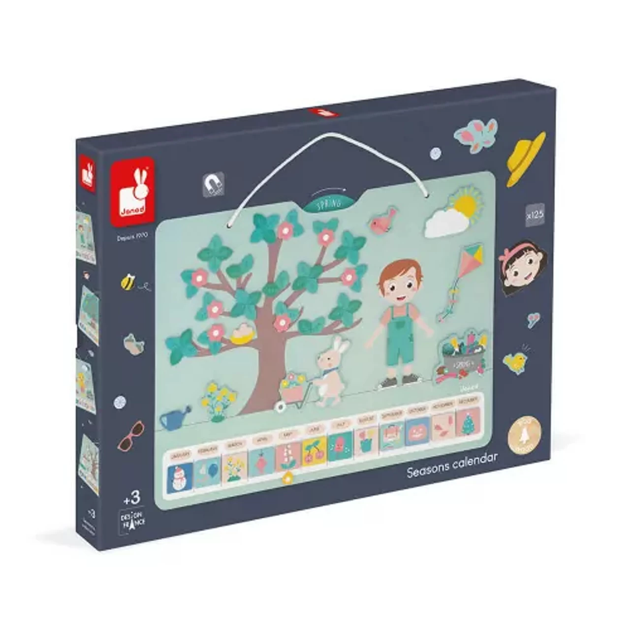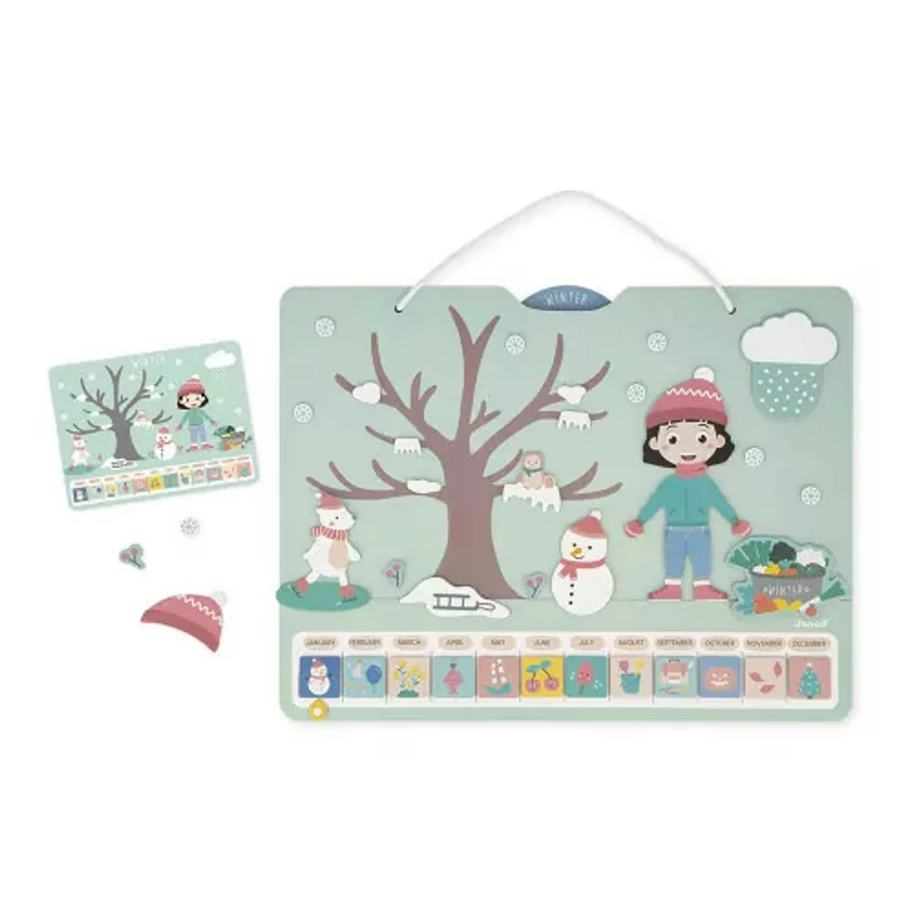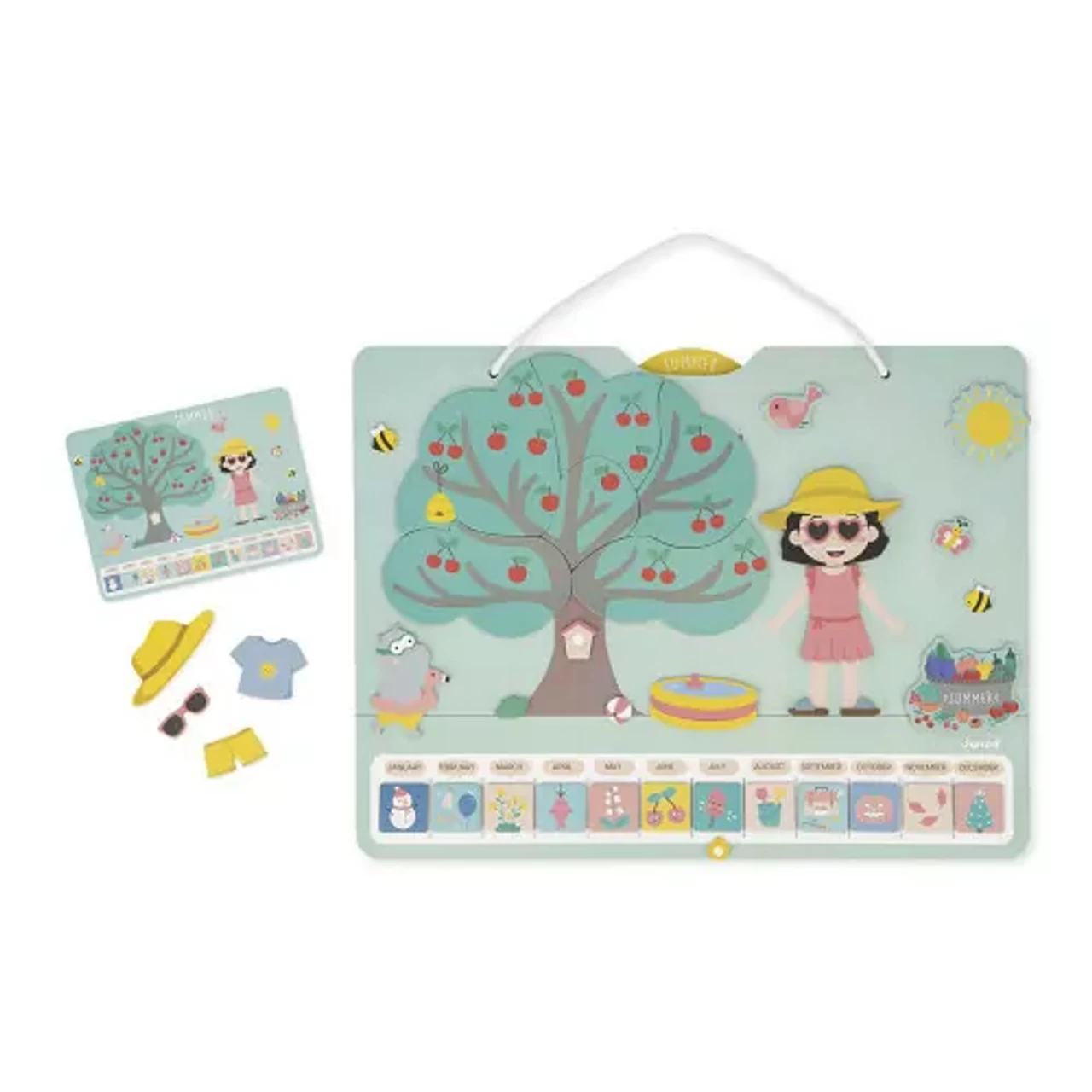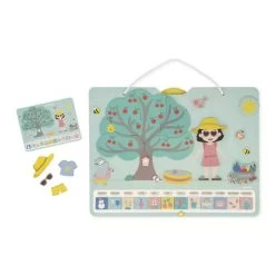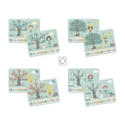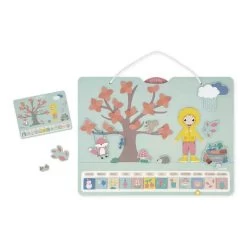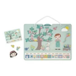 Educational toy in English. How to support children in their learning about time and the seasons? With a beautiful wooden magnetic picture that will make it easier to understand changes and the notion of time! This beautiful educational toy, which is recommended for children aged 3 and up, enables them to grasp the particularities of each season. Children will be able to change this large magnetic wooden picture (42 x 32 cm), thanks to the 125 magnets representing the 4 seasons, and all in a fun way. The 4 template cards will help them in their learning. On the top of the picture, there is a wheel which indicates the season. Winter, spring, summer and autumn will soon have no secrets for little ones, who will be able to adapt the scene to the season and establish a real routine. In addition, 12 beautifully illustrated ‘month’ magnets also allow them to understand the chronology of a year and find their way around it. This calendar with its beautiful illustrations will make a lovely wall decoration for the bedroom, it can be hung up using the attached cord. To avoid losing them, the magnets can all be stored in the compartmentalised box.