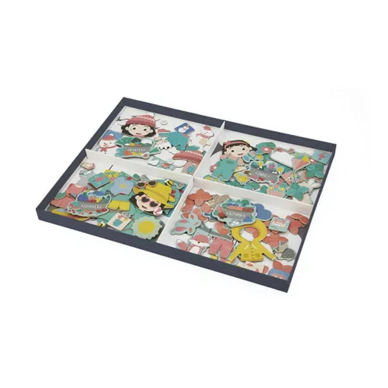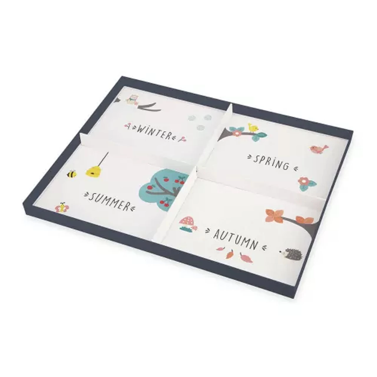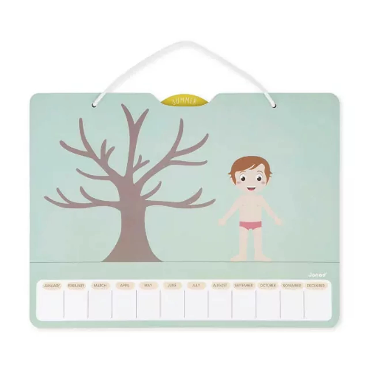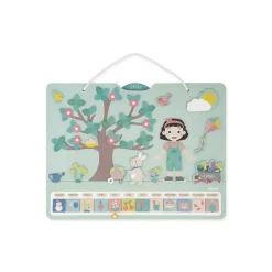 Educational toy in English. How to support children in their learning about time and the seasons? With a beautiful wooden magnetic picture that will make it easier to understand changes and the notion of time! This beautiful educational toy, which is recommended for children aged 3 and up, enables them to grasp the particularities of each season. Children will be able to change this large magnetic wooden picture (42 x 32 cm), thanks to the 125 magnets representing the 4 seasons, and all in a fun way. The 4 template cards will help them in their learning. On the top of the picture, there is a wheel which indicates the season. Winter, spring, summer and autumn will soon have no secrets for little ones, who will be able to adapt the scene to the season and establish a real routine. In addition, 12 beautifully illustrated ‘month’ magnets also allow them to understand the chronology of a year and find their way around it. This calendar with its beautiful illustrations will make a lovely wall decoration for the bedroom, it can be hung up using the attached cord. To avoid losing them, the magnets can all be stored in the compartmentalised box.