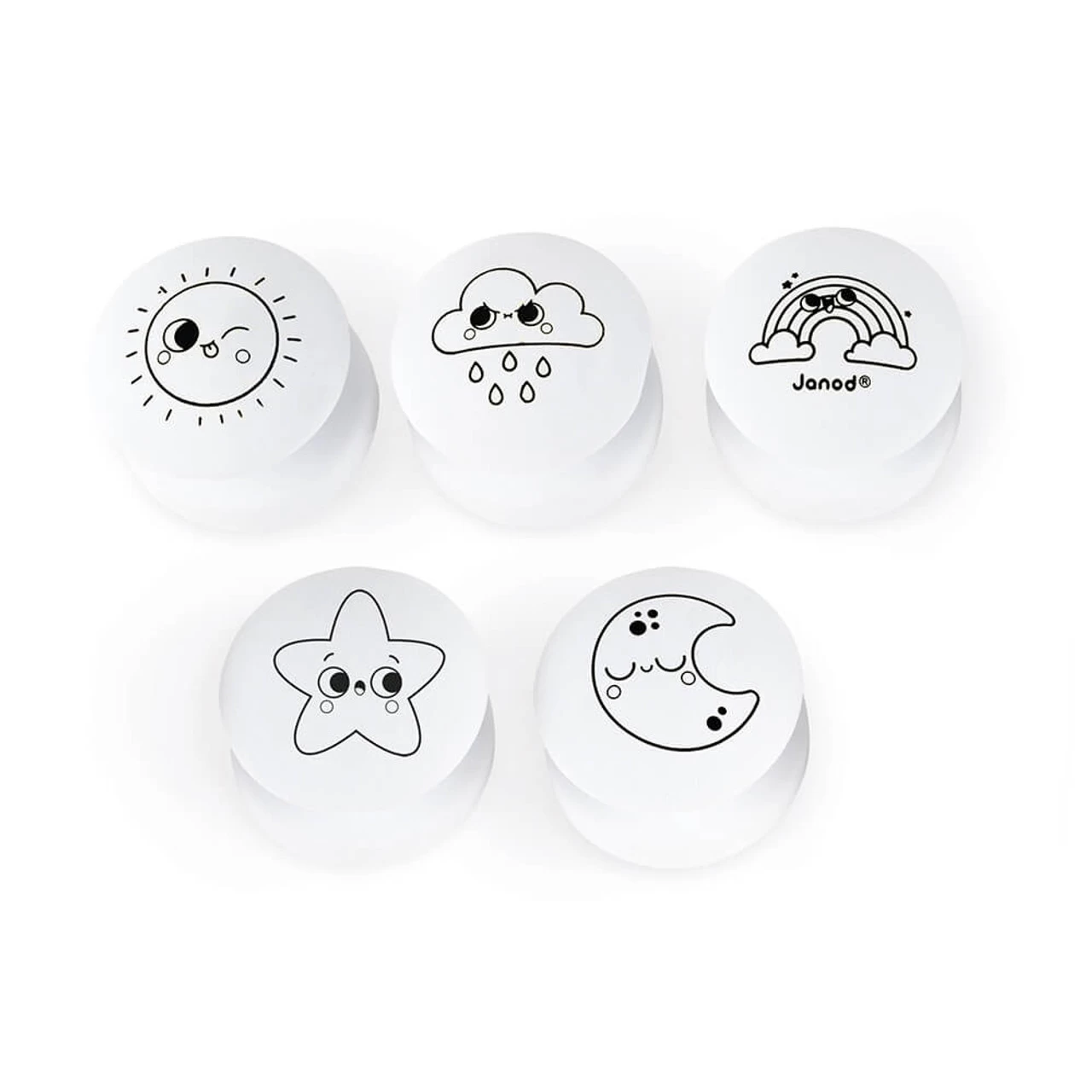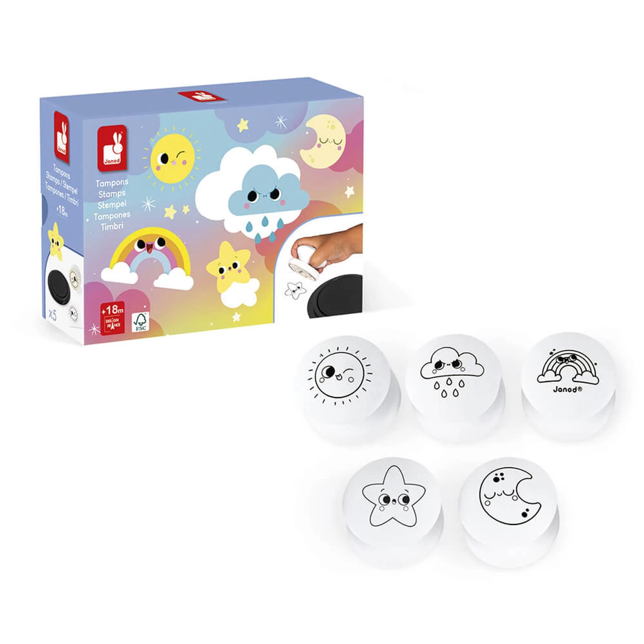 Our baby artists have an appointment in the land of the rainbow! From 18 months, it’s easy to start creating with these large foam stamps, with their ergonomic shape, perfectly suited to little hands. The laughing sun or the sleeping moon, which will be baby’s favourite design? All they have to do is grab some pretty coloured pencils and colour in these beautiful pictures. This activity is ideal for developing fine motor skills and imagination from an early age. This manual activity set for little ones contains 5 stamps and 1 black ink pad. This product is made of FSC® -certified and other controlled material.