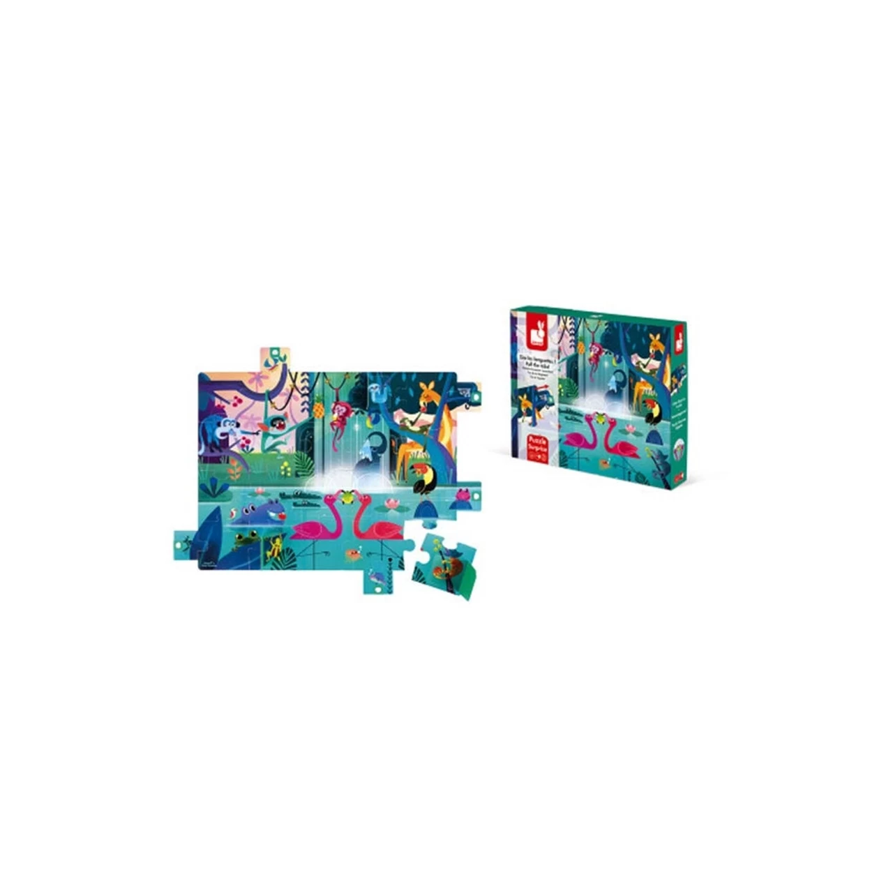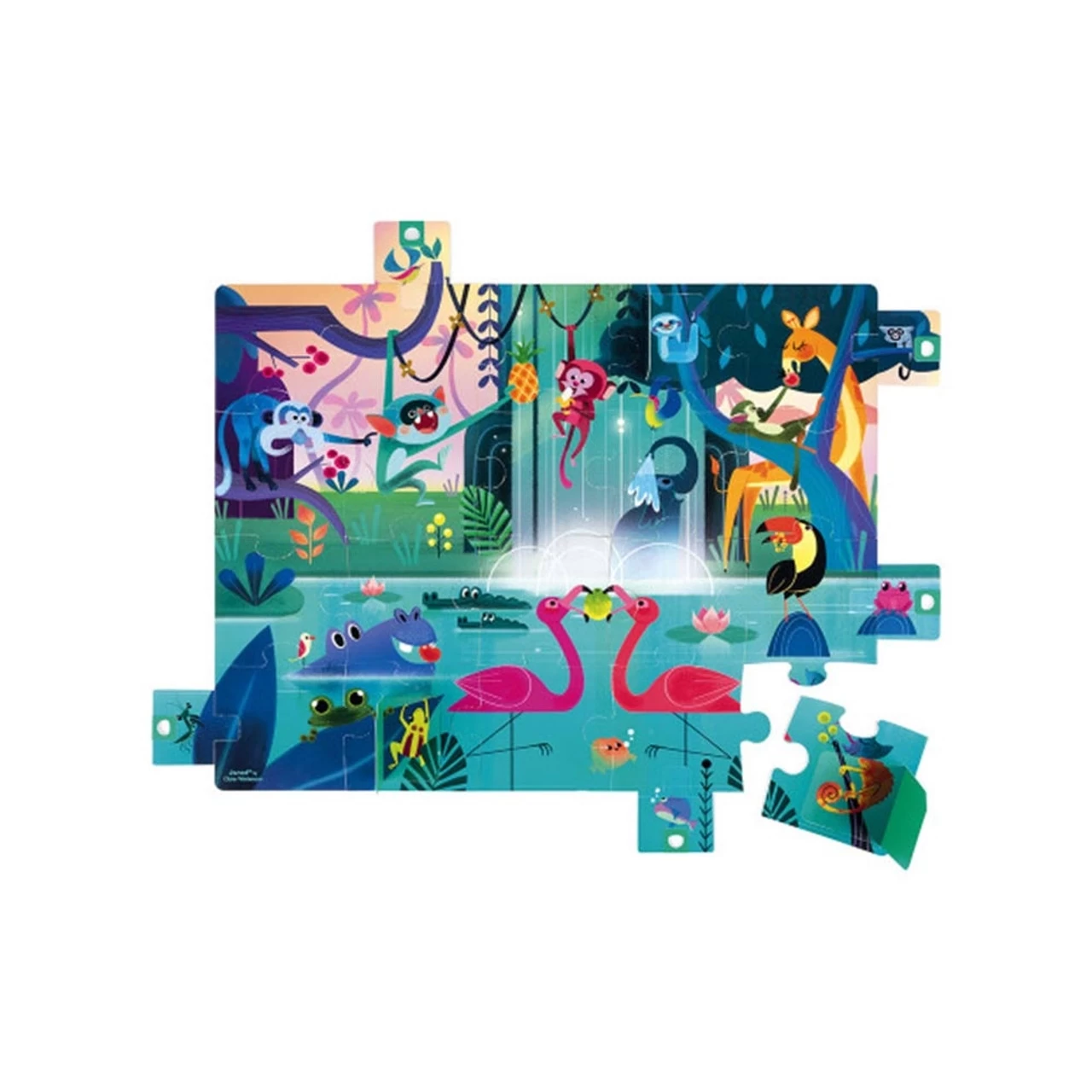 Giant 20-piece puzzle made of stiff cardboard, with 8 surprise pieces! 5 pull-out tabs to enlarge the puzzle and 3 windows to open to explore lots of surprises hidden in the illustrations. Where is the sloth hiding? What is this insect hidden on its leaves? Did you see the chameleon change colour? Illustrations in soft colours based on the theme of jungle animals. Poster included. Puzzle : 65 x 50 cm (25.6 x 19.7 in).