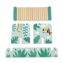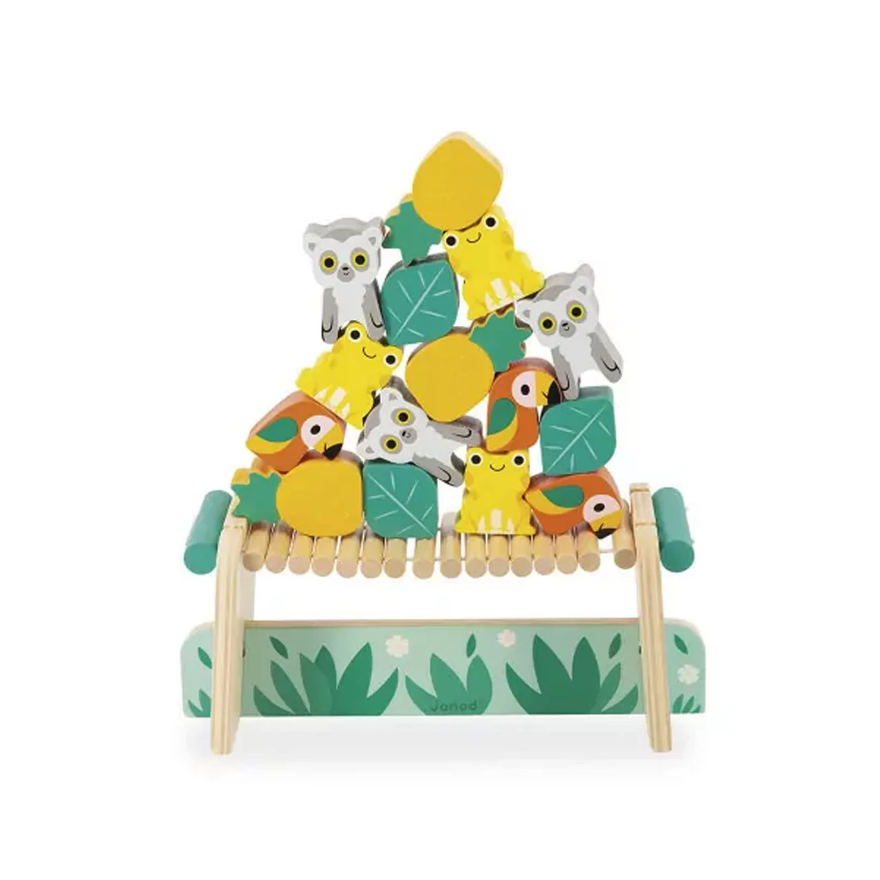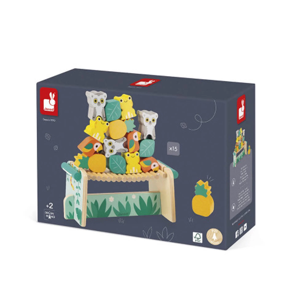 Will there be room for everyone on the suspension bridge? This wooden monkey bridge in the heart of the rainforest is ready to accommodate a host of animals who wish to cross! Frogs, lemurs and parrots, but also leaves and pineapples will have to find their balance in this colourful game of skill. First assemble the bridge in 3 parts, then have fun alone or with others stacking the elements without making them fall! A wooden balancing game for children aged 2 and over. A total of 15 pieces to be stacked, which will help baby develop dexterity and concentration: they will have to be meticulous and patient to keep all these funny animals on the bridge! This early learning toy is made of wood from sustainably managed, FSC®-certified forests. Water-based paint.