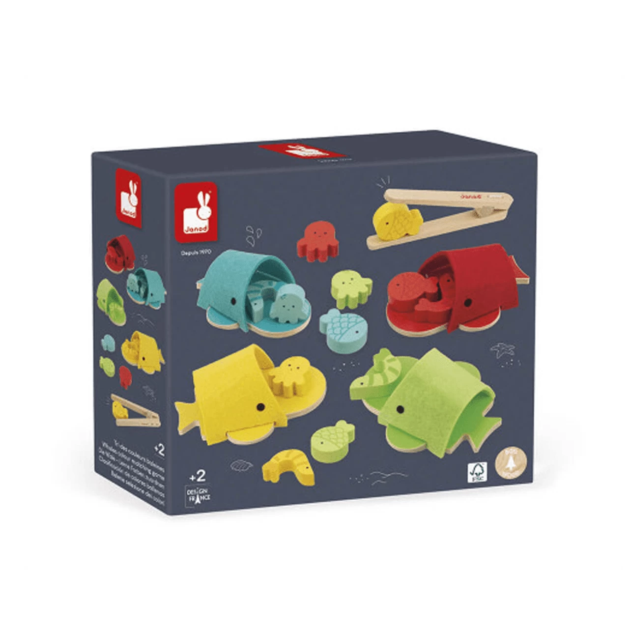 Colourful whales are seeking a feast to savour! With this colour sorting game, children from 2 years old will be able to familiarise themselves with colours while developing their fine motor skills! With the help of the wooden tongs, you catch the small sea creatures (12 in all) and place them in the mouth of the whale of the corresponding colour. A fun and educational wooden game where fish and shrimp will keep little ones company! Handling of the tongs promotes the development of fine motor skills, you will have to show dexterity to put the creatures in the right place! A wooden early years toy from sustainably managed, FSC®-certified forests.