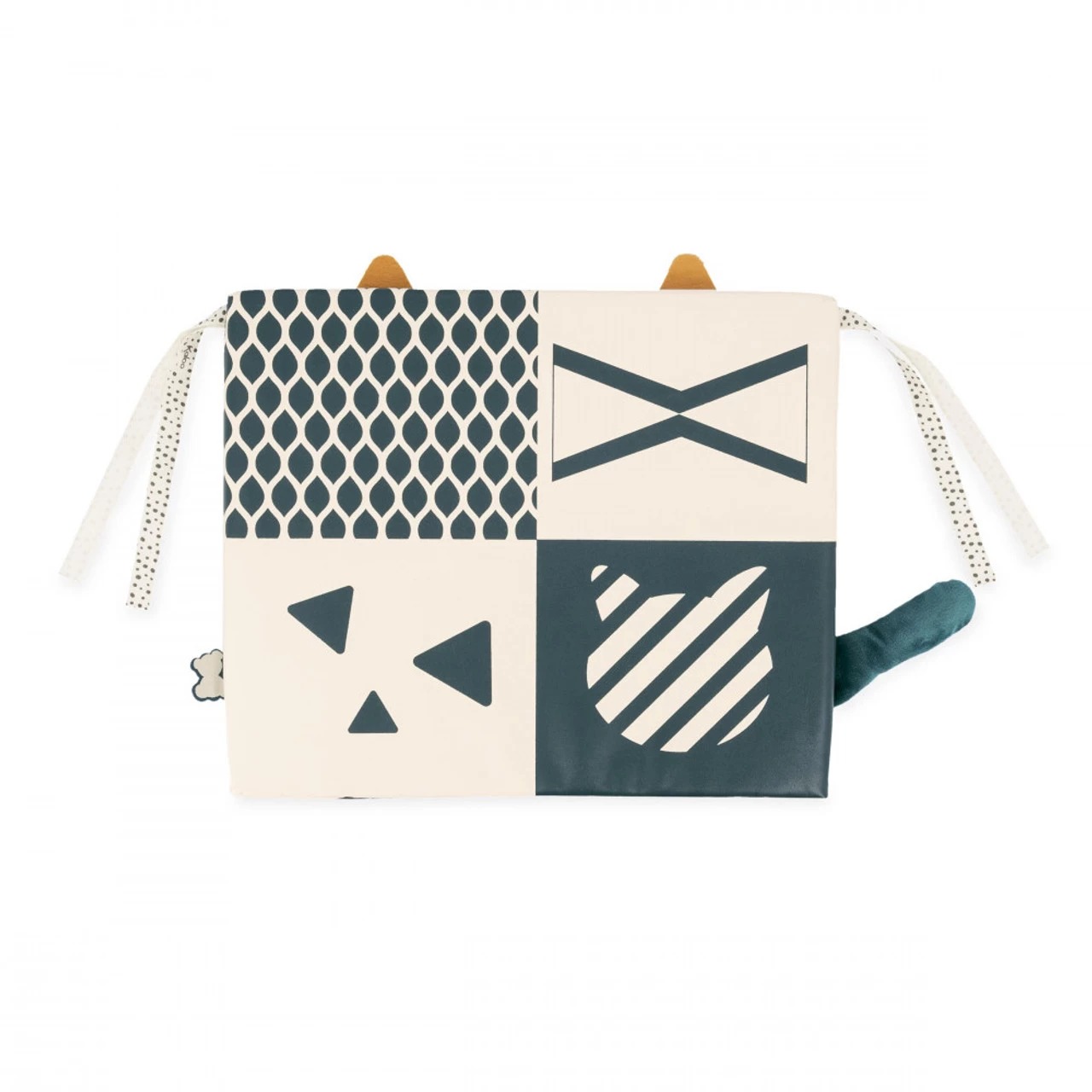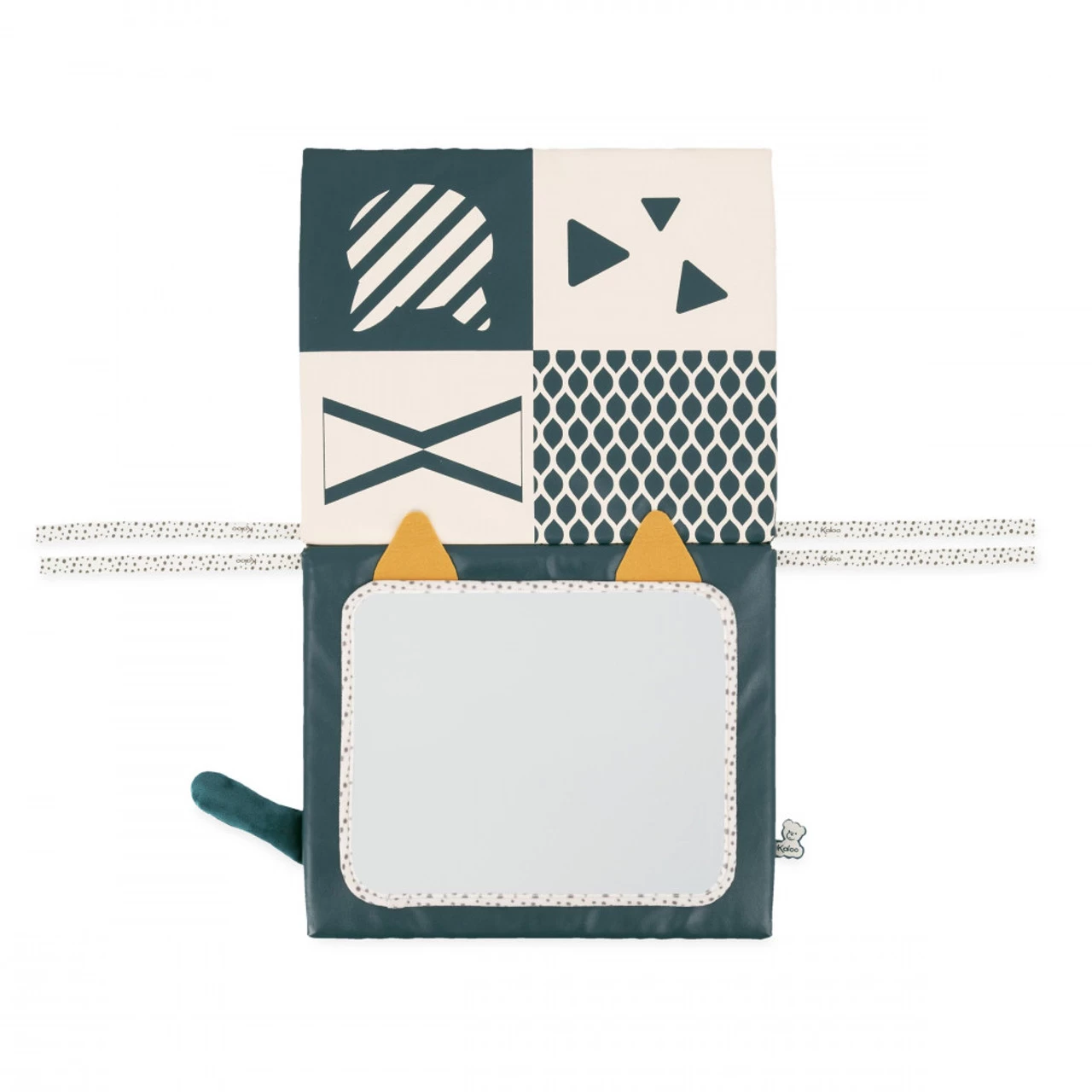 Designed and produced in collaboration with psychomotor therapists, this sensory mirror (9,56 x11,31 inches) is a great, fun way of stimulating baby’s senses. The mirror will allow baby to see his reflection, which will particularly develop his sight and his curiosity. It is double-sided and can stand up. Its ribbons allow you to hang it everywhere! Each side allows baby to learn new things: to distinguish different shapes and colors. The cat’s ears and tail in soft materials also help develop the child’s grasping and touch. This sensory mirror is ideal for developing baby’s senses and curiosity. Key features: