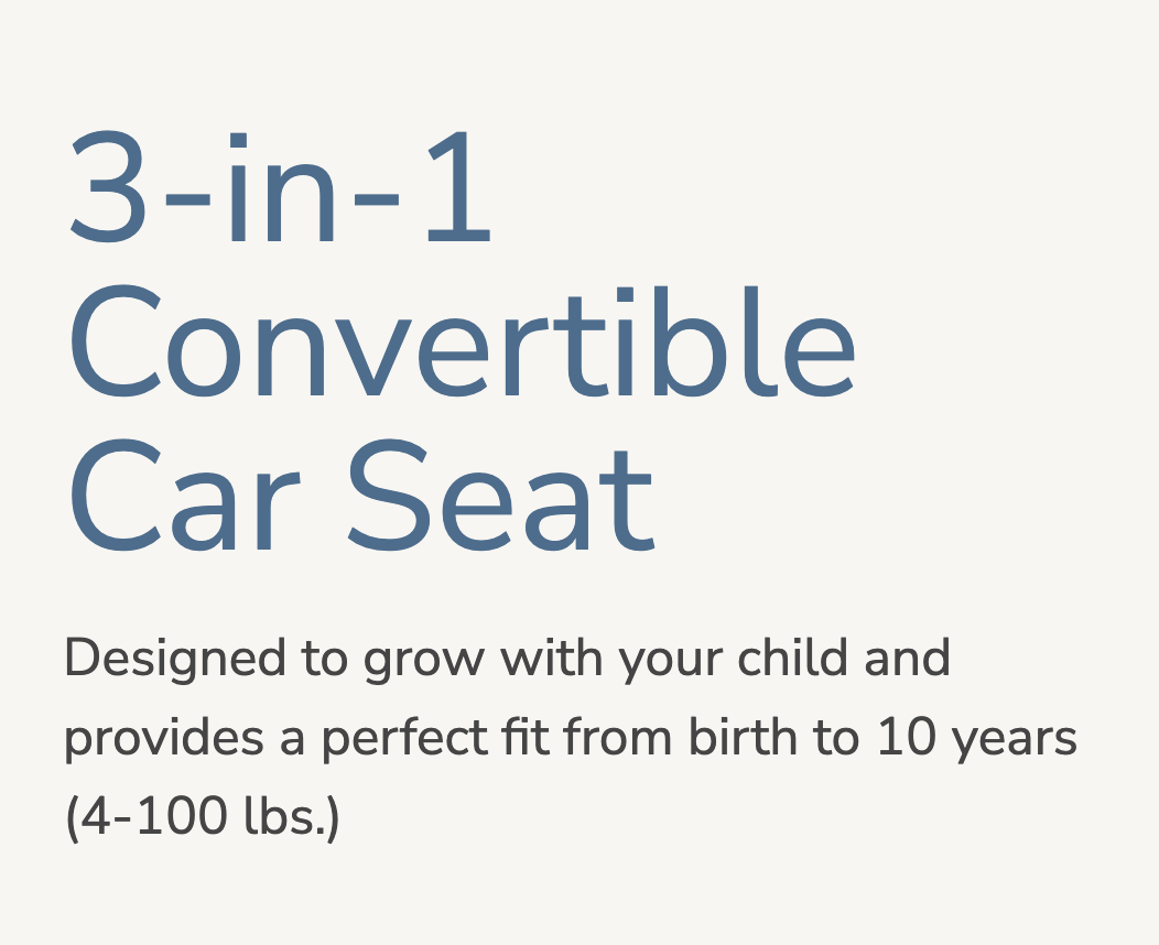 | All-in-One Seating System  Rear-facing, from 4-40 pounds; forward-facing to 65 pounds; and up to 100 pounds in booster mode.