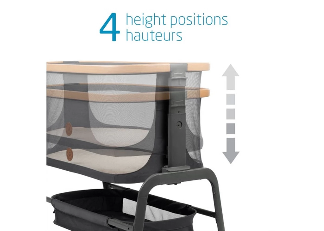 The Maxi-Cosi Iora Bedside Bassinet features modern styling and an innovative adjustable design to let you position it close to your bed for easy access to your baby at night. Bassinet adjusts sideways and vertically and folds flat for portability.