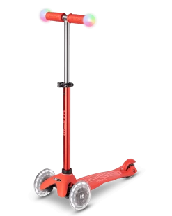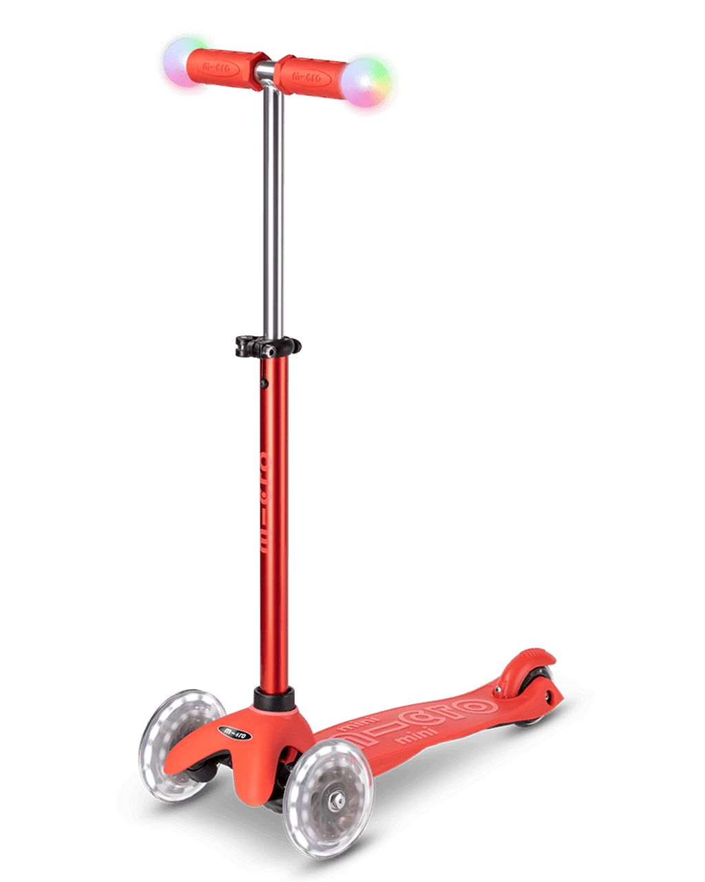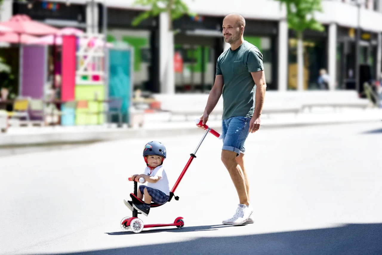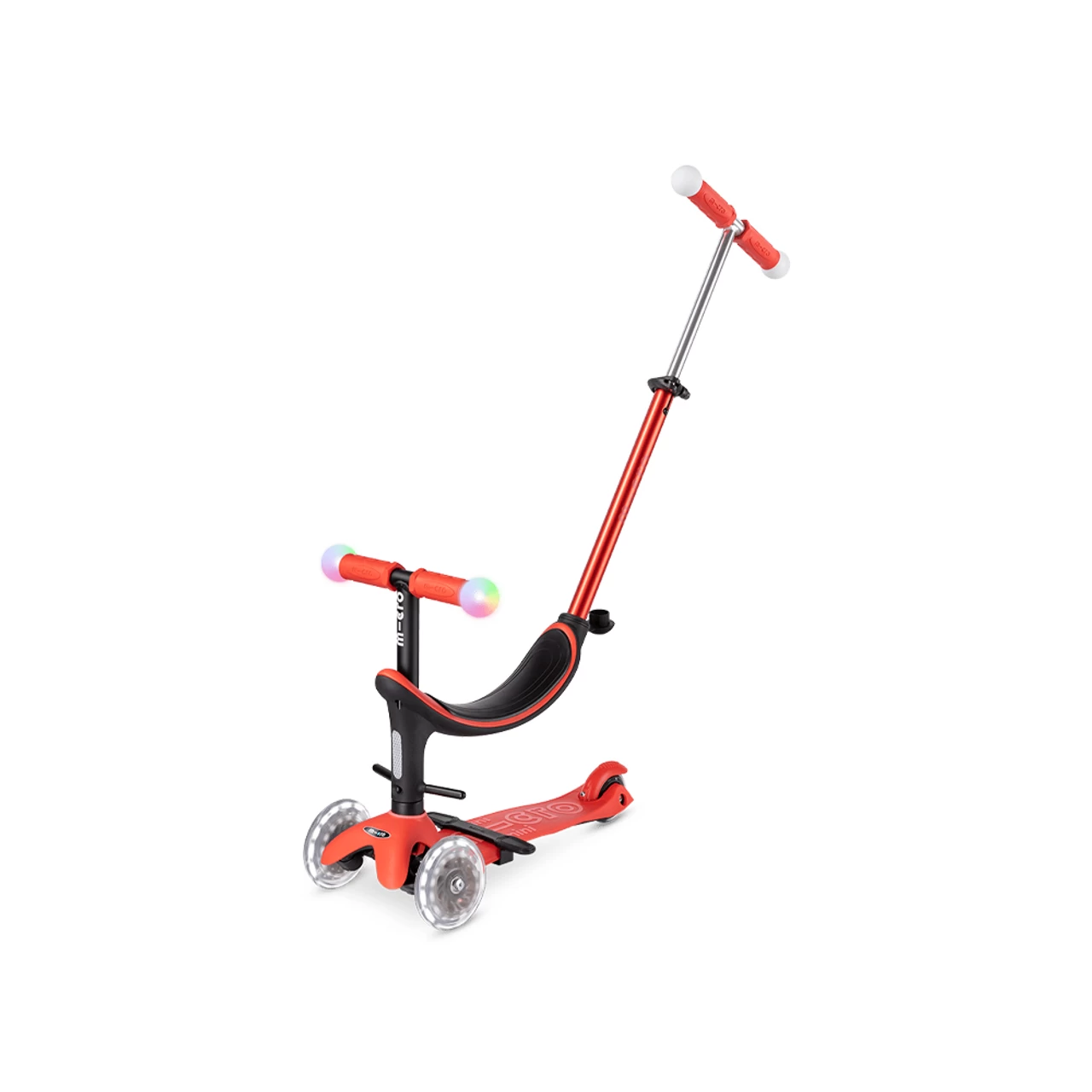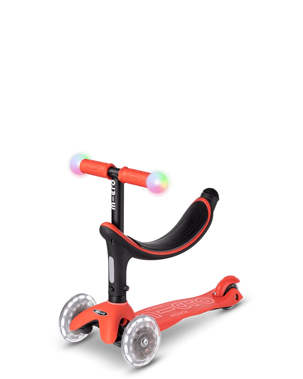 The Micro Mini2Grow Deluxe Magic LED is the perfect companion for the first years of your child’s life. Thanks to its multifunctionality, it can be used from the age of 12 months and will accompany your child until at least the age of six. The innovative and ergonomic all-in-one scooter can be used in different variations: at the very beginning with seat, two footrest options and push bar for the parents, later on without push bar, as a mix between balance bike & scooter and finally as a classic Mini Micro Deluxe with magic LED light bulbs on the handlebar and LED moon wheels. The push bar for the parents can be used vertically in addition to the standard horizontal position. This means that only one hand is needed for pushing, thus protecting the wrist and muscles. In addition, the Micro Mini2Grow Deluxe Magic LED convinces with a height-adjustable handlebar, a patented lean-to-steer mechanism and an extra grippy footboard.