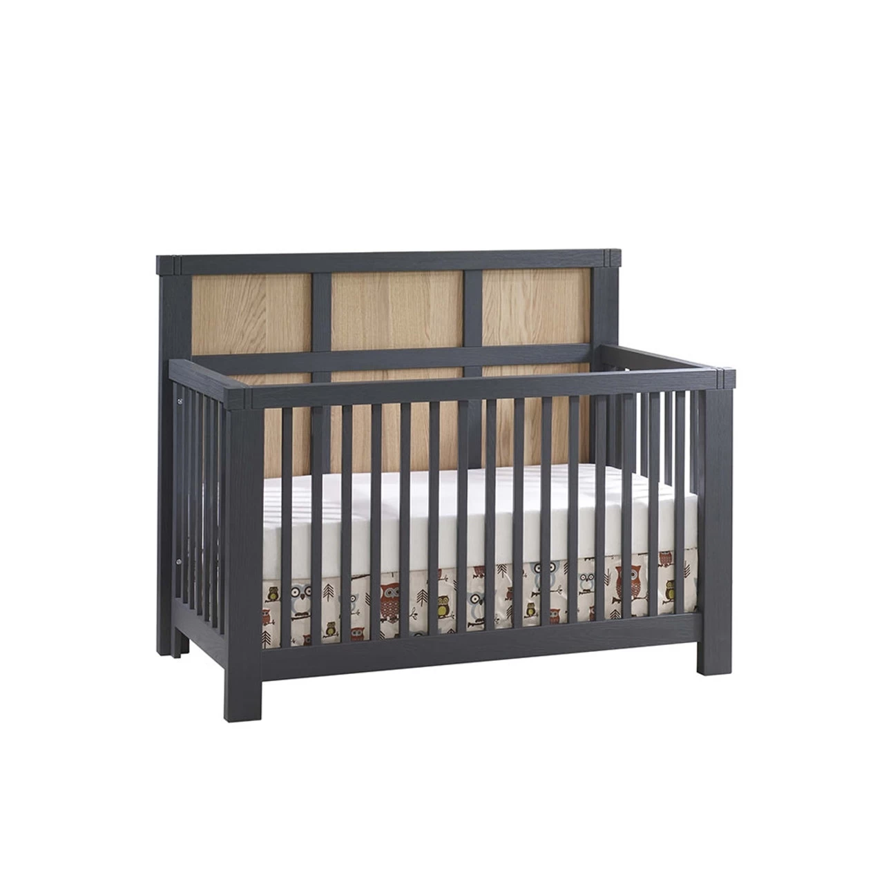 The Rustico Moderno “5-in-1” Convertible Crib is highlighted by chunky top moldings with an open mortise & tenon detail, an elegantly framed back panel and one-piece corner posts. It offers long term value with five configurations: crib, toddler bed, daybed, double bed headboard and complete double bed.