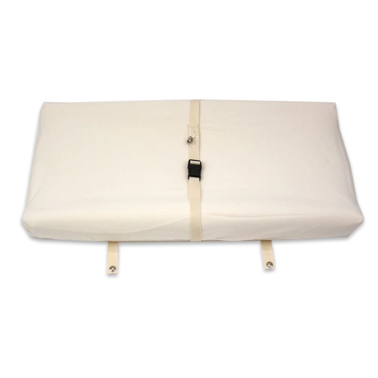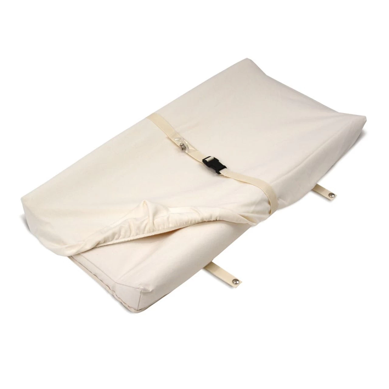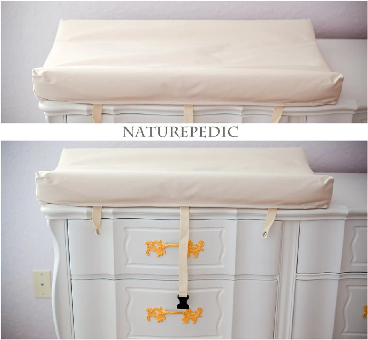 Features a luxurious organic cotton fabric with a clear food-grade waterproof coating made from non-GMO sugarcane. Non-allergenic and easy-to-clean. Safety buckle helps secure baby while changing and snap screws included to secure the pad to a dresser while at home.