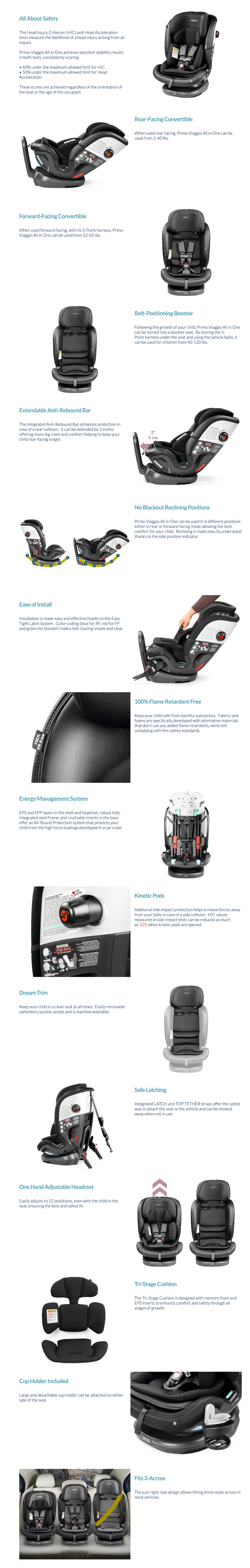 Primo Viaggio All in One is used from birth up to an age of 10+ years. As your baby grows, adjust the 12-position headrest & harness in seconds to create the perfect fit. When it is time for booster mode, simply tuck the harness into the built-in storage compartment.