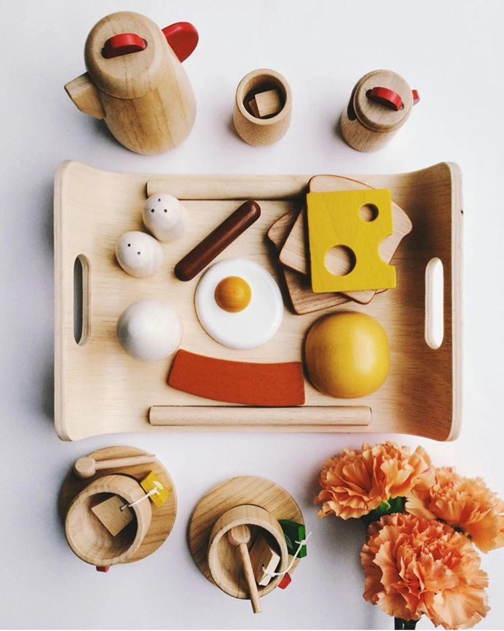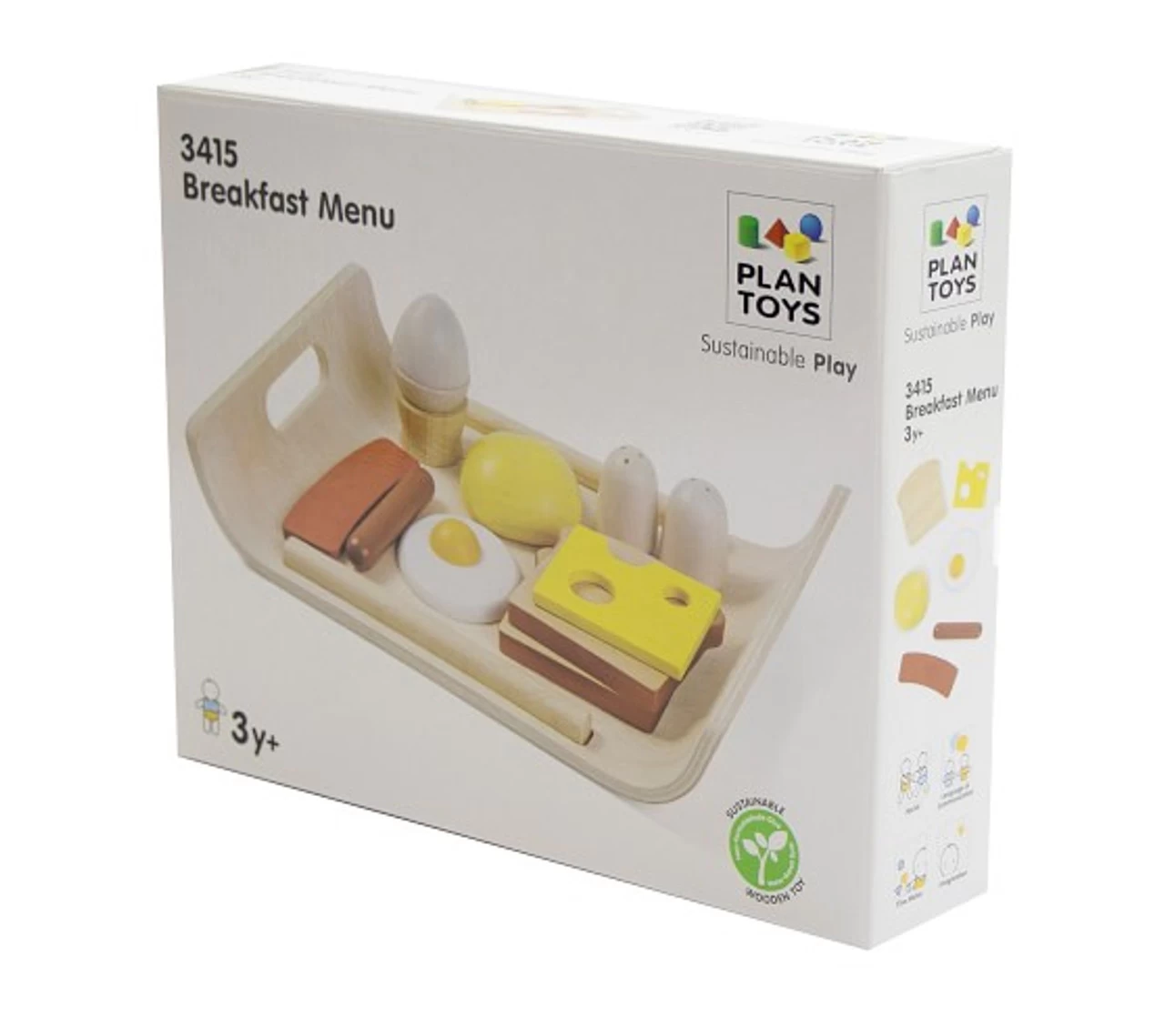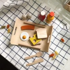 Your little one will love serving up a delicious breakfast for you with this menu set, featuring everything from bacon to boiled eggs. The set includes 2 slices of bread, a bun, sausage, bacon, cheese, fried egg, boiled egg, salt, and pepper that are served on a tray.Â