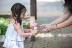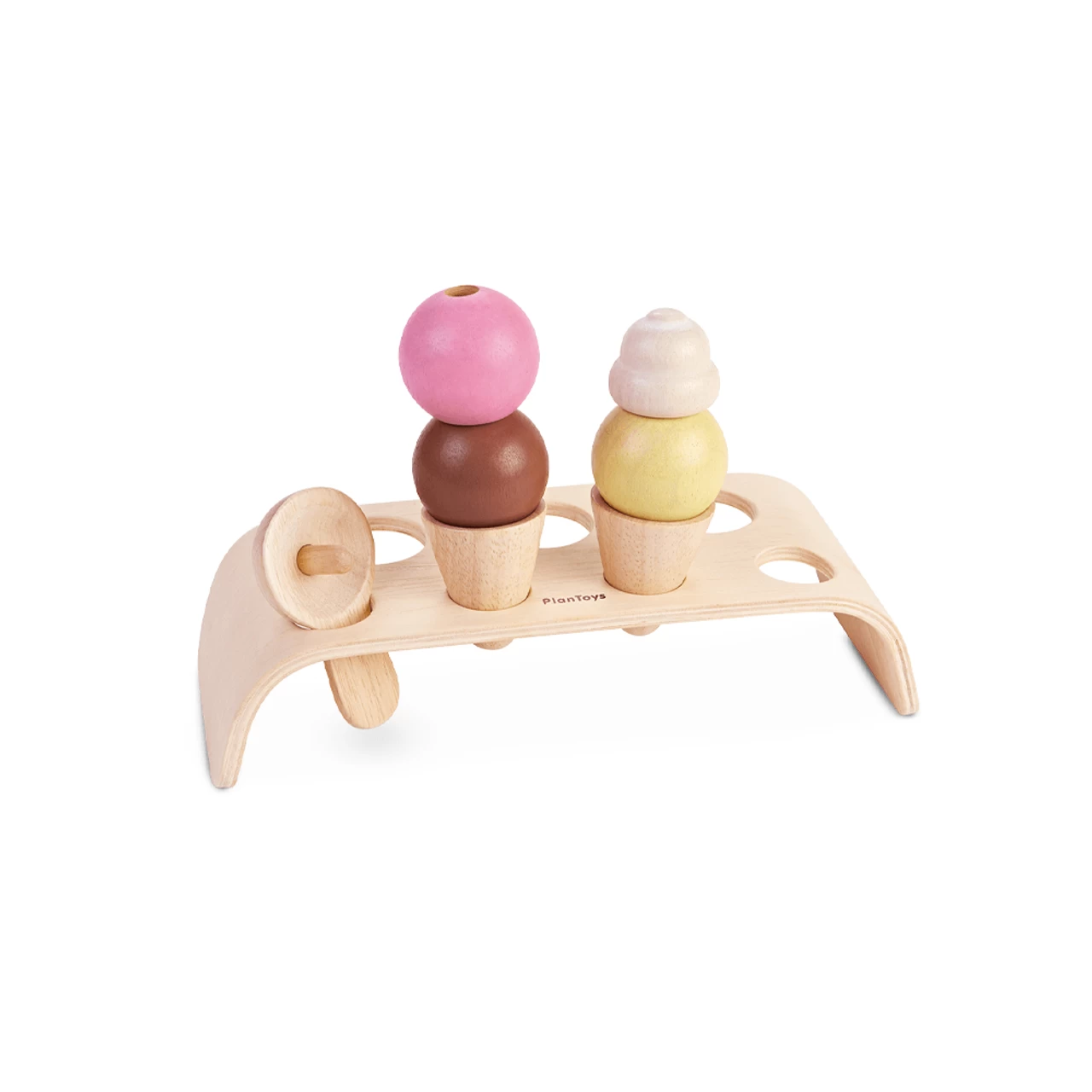Create your own ice cream combo! The set includes 3 different ice cream scoops, 1 topping, 2 cones, and 1 scooper. This toy helps enhance fine motor skills and hand-eye coordination.