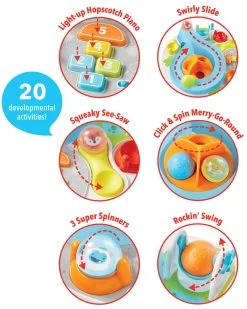 - 20 developmental activities include: Squeaky See-Saw, Swirly Slide, Click & Spin Merry-Go-Round and Rockin’ Swing